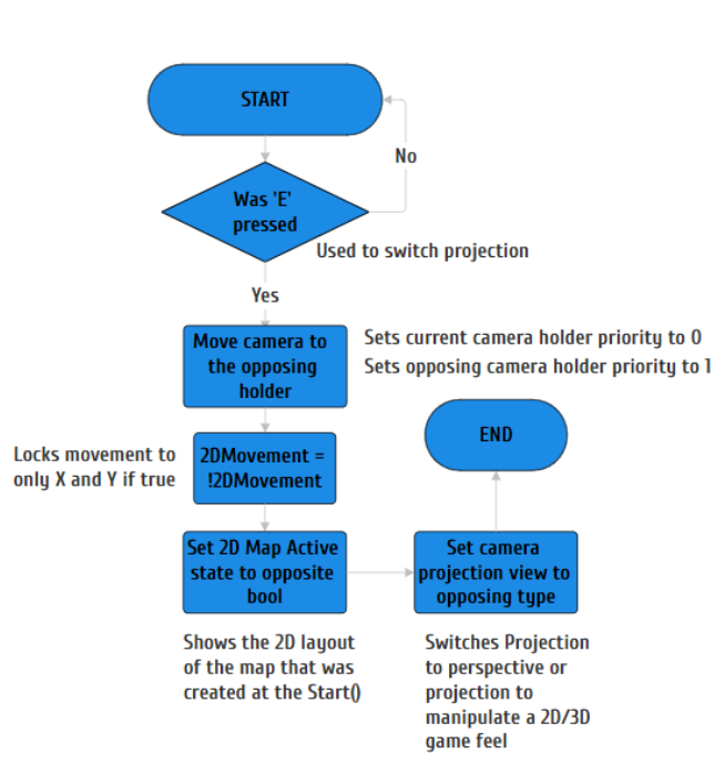 The flow chart above shows my rough plan on how I would plan out the implemntation of the main mechanic for Alternate Projections, that being how I will be able to switch from a 3D to 2D and vice versa. The main keybind to execute this will be "e" and if the player was to press it I plan to use cinemachine functionalities to help move the main camera to the oposing cinemachine camera and can do this with changing the priorities of the two cameras. Once thats complete I plan to toggle a boolean that locks 3D movement, restricting it to only left, right up and down.
