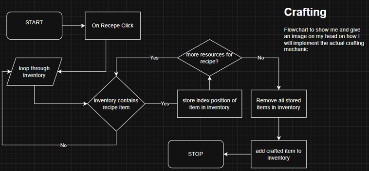For the recipes, I decided to make another set of scriptable objects, by referencing an array of Items (the other scriptable object that holds that data of all resources and tools), as well as the item rewarded after the craft as an Item object, as everything the player crafts will be added to their inventory. When a certain recipe is clicked, it checks through the whole inventory to see if it has the items that are in the recipe and stores the index position in a temporary array, if there are more items in the recipe, it continues along with the inventory to attempt to find that item in the inventory and stores them to the array If they have been found. If all items have been found, it goes through all the elements within the temporary array and removes all those items from the inventory, after that is complete, it goes ahead with adding the crafted item to the inventory