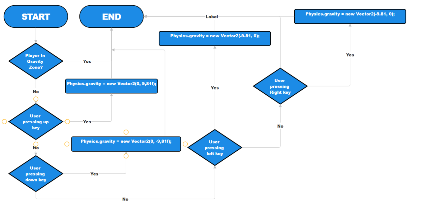 The flow chart above shows my rough plan on how I would plan out the implemntation of the main mechanic for Gravikinesis, that being the alteration of gravity that the player will be able to control. First of all I needed to make sure that I could identify when the player is currently within an area that forces the gravity, I thought of using the 2D OnTrigger methods that Unity includes and changing a boolean whenever the player enters and leave that certain areas. If that boolean was to be false, it would mean that the player is not in a forced area of gravity and therefore allows the player to use the mechanic where they can manually control the gravity with no restrictions. I had the idea to be able to make the gravity pull objects in a certain ways (up, down left and right) with the use of the 2DPhysics.Physics = new Vector2(x,y).