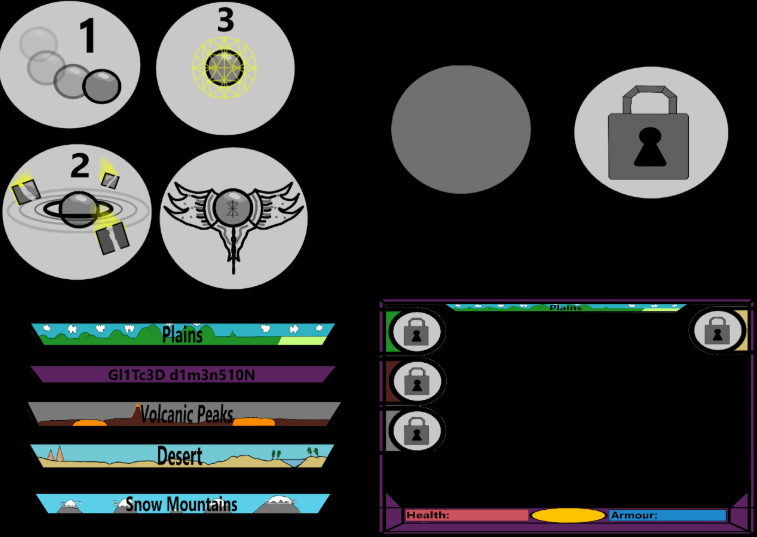 The ability icons are the icons that can be found on the top right part of the image above, these icons are made from me and created with the help of Krita. Each icon has some correspondence to their ability that they represent (for example, The Invincibility Ability icon has a forcefield around the ball to represent defense). Each ability icon has their unique keybind to show the player what keybind is the action to activate a certain ability, however the teleport ability has no keybind as it will eventually be designed to open up a map of the game showing all the shrines that the player can teleport to. Once activating an ability, I want to use the gray icon (can be found in the top right of the image) to cover the ability and paste a countdown onto the gray icon to indicate how long until the player can use the ability again. The assets found on the bottom left of the image will tell the player which biome they are currently in. The bottom right asset holds my final design of the prototypes Heads Up Display. Containing a slot for ability icons, the health/ armor/ score of the player as well as what biome the player is in. I wanted to maximise the amount of information that the player is given however also try to balance how much the player can see (gameplaywise).